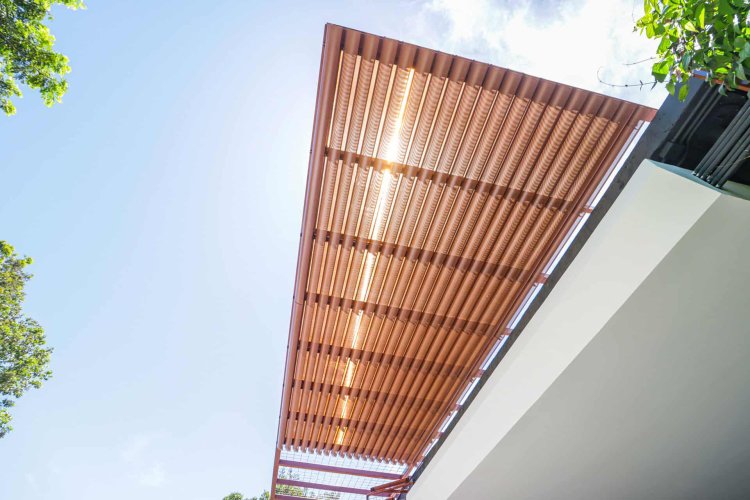 El quiebravista Celoscreen es una solución al control solar pasivo, compuesto por perfiles portapaneles y paneles en aluzinc pre pintado liso o perforado. Este producto es muy útil para los espacios destinados al intercambio de aire y control de visión, tanto en paramentos verticales como en muros cortinas y logias de edificios habitacionales, o como cortasol cenital. El quiebravista Celoscreen, es una aplicación que permite el contraste con terminaciones de muro liso o en combinación con otro tipo de revestimiento.