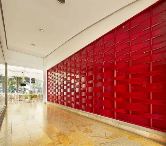 StripWave es un producto simple, pero que permite lograr resultados muy interesantes. Se trata de cintas o flejes metálicos que van tejiendo entre perfiles tubulares propios del sistema, logrando una imagen final similar a un tejido, pero a gran escala, permitiendo además generar transparencias y opacidades.