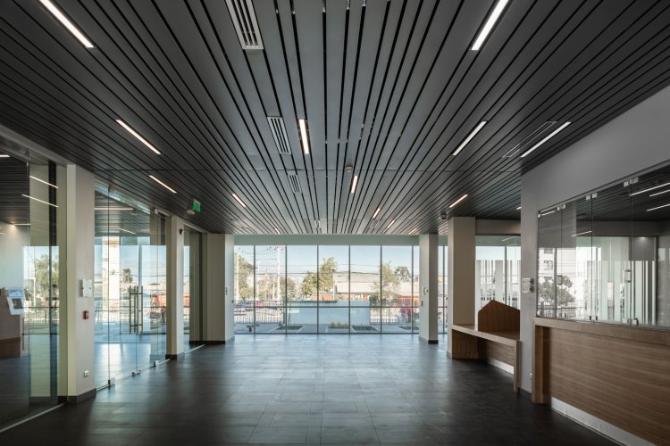 Cielo metálico de paneles dispuestos paralelamente, de apariencia regular y plana
