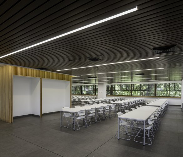 Los CIELOS LINEALES U consisten en paneles dispuestos paralelamente soportados por un portapanel universal. Su aspecto varía dependiendo de su modulación. Su apariencia es regular y plana, con una separación entre paneles de 20mm (cantería).