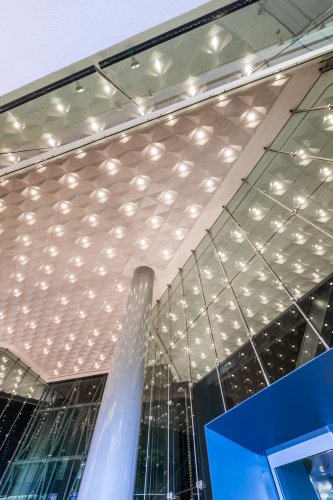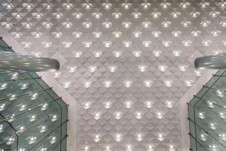 Cielo metálico modular tridimensional formado por bandejas volumétricas piramidales