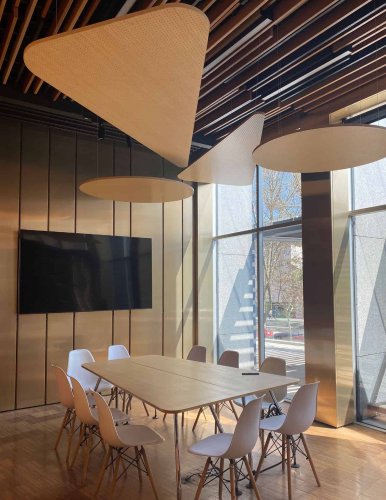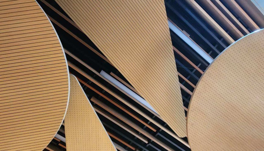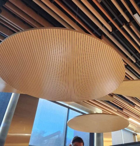 Las Nubes de Madera son un sistema de cielo suspendido tipo isla individual que permite dar solución a la reverberación acústica de los recintos, gracias al alto coeficiente de absorción acústica (NRC) que posee. Al mismo tiempo, es un producto liviano y fácil de instalar, que ofrece el cálido aspecto de la madera, ideal para diseños interiores.